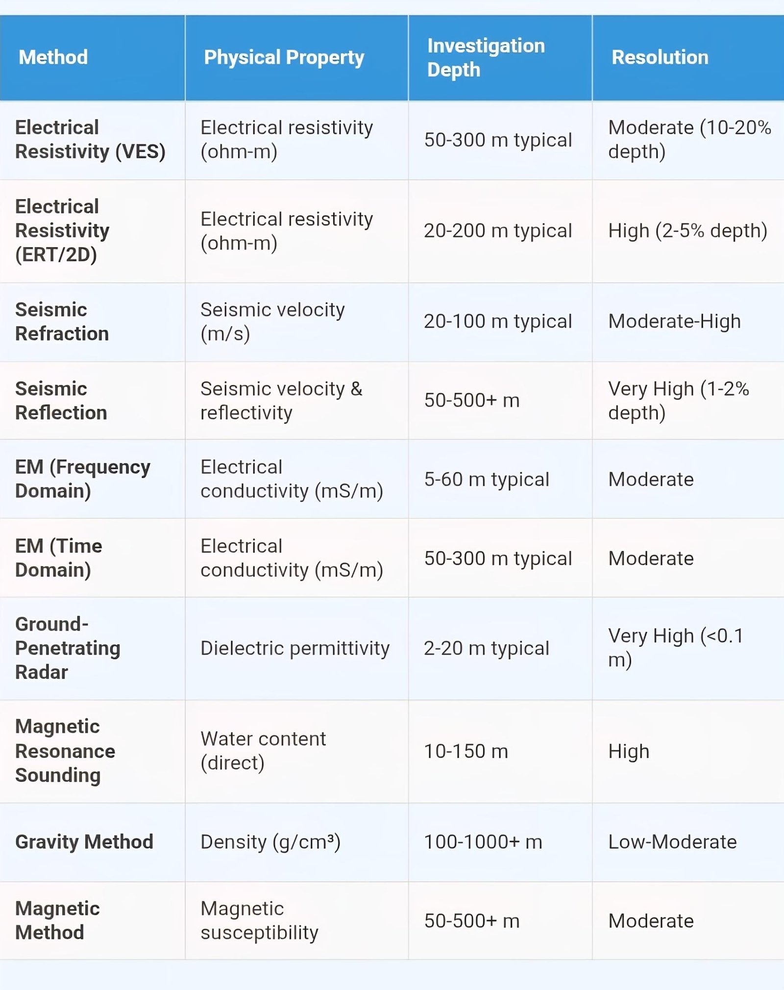 • Technological Advances: Recent innovations including multi-electrode resistivity imaging systems, airborne electromagnetic surveys, magnetic resonance sounding for direct water detection, time-domain electromagnetic methods, and integrated inversion algorithms improve resolution, reduce costs, and enable deeper investigations reaching 500+ meters compared to traditional 100-200 meter limitations