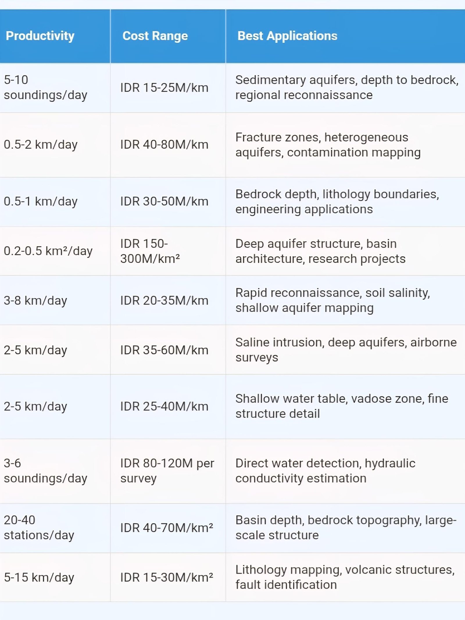 • Cost-Effectiveness Range: Survey costs vary substantially from IDR 15-25 million per kilometer for basic electrical resistivity to IDR 150-300 million per square kilometer for comprehensive 3D seismic surveys, with typical exploration projects requiring IDR 200-800 million total investment depending on site complexity and target depth