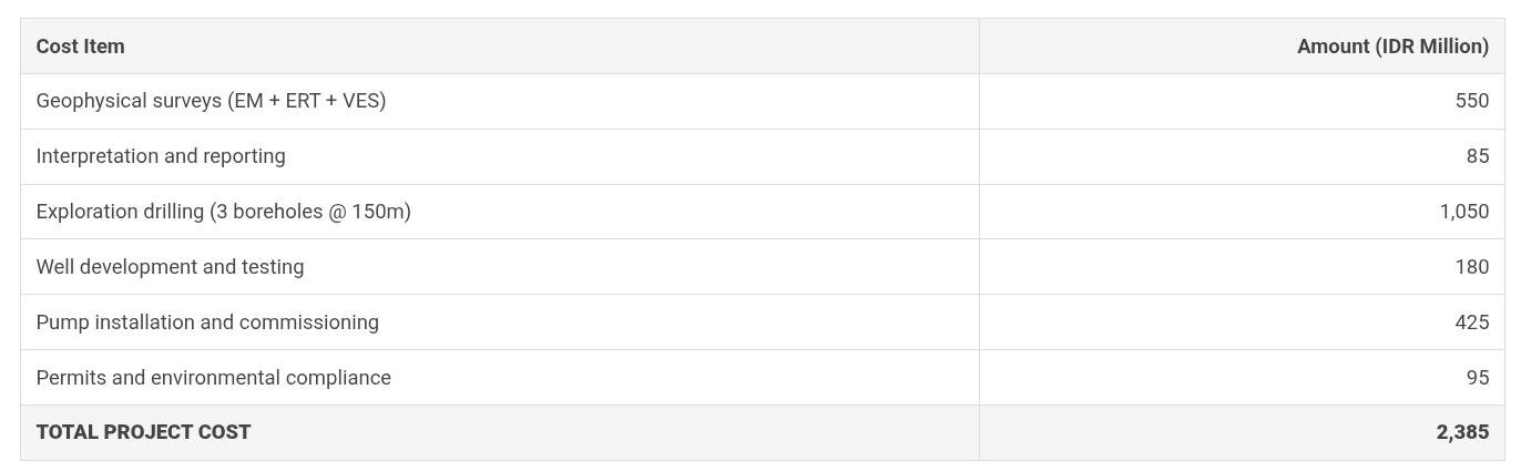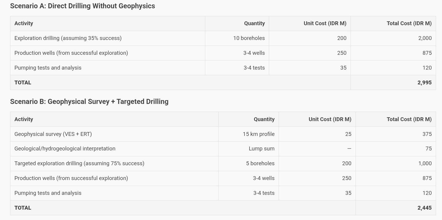 • Estimated 6-8 boreholes needed without geophysics @ IDR 350M each = IDR 2,100-2,800M drilling alone