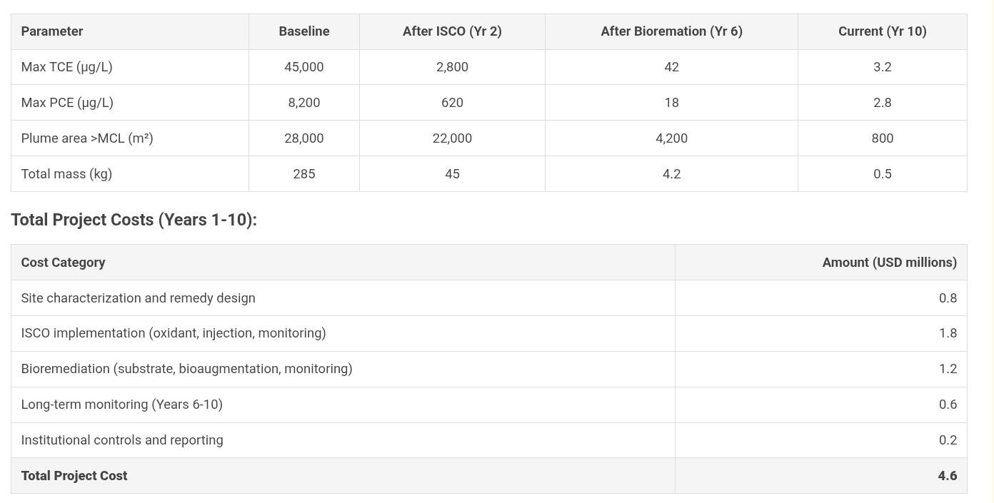 Currently Year 10, contaminant concentrations declining below MCLs throughout most of plume. Monitoring frequency reduced to semi-annual. Closure anticipated Year 12-13 after demonstrating sustained compliance through statistical evaluation. Institutional controls will remain until complete aquifer restoration confirmed. Integrated approach achieved cleanup 60% faster and 50% cheaper than conventional pump-and-treat alternative while demonstrating sustainability advantages through permanent contaminant destruction versus transfer to treatment media.