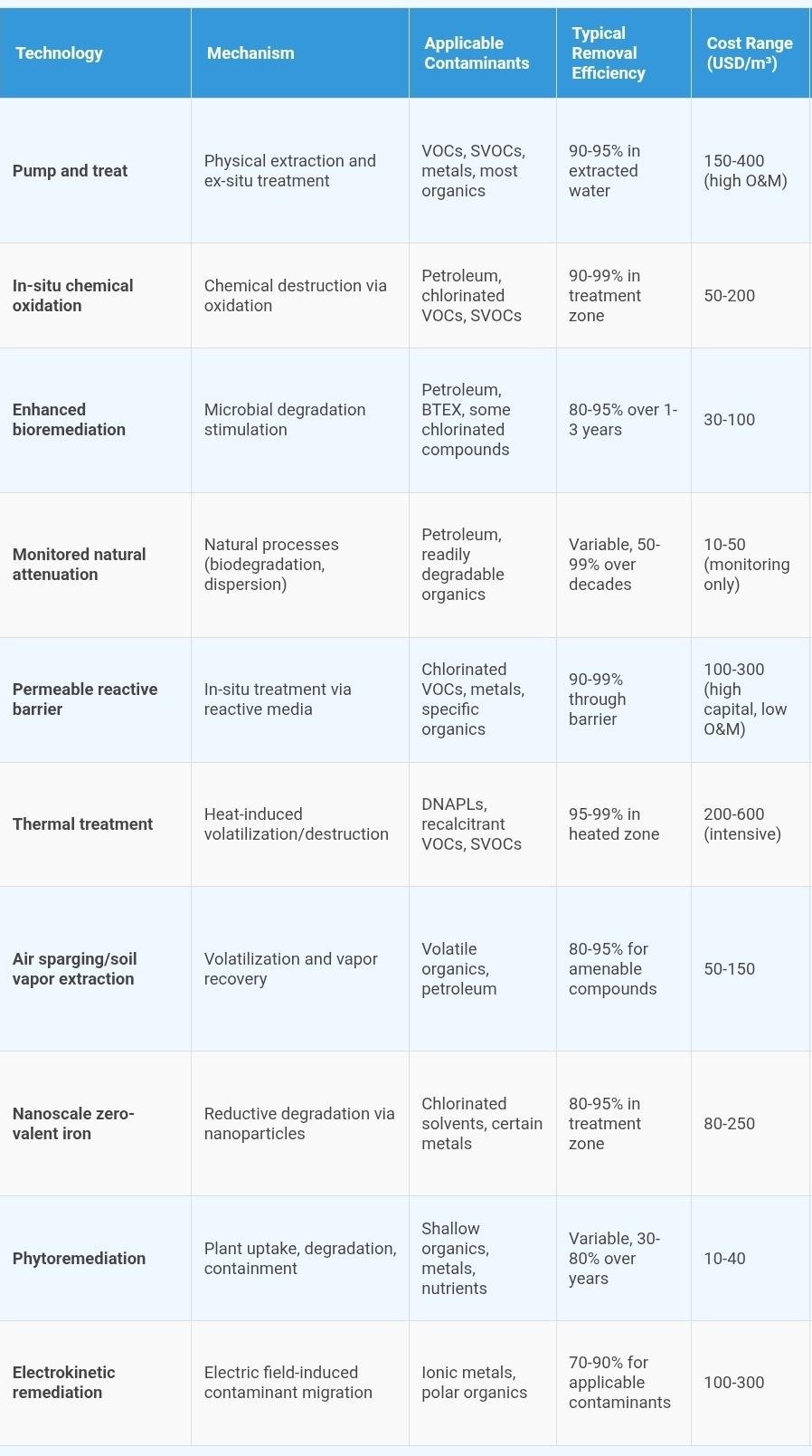 • Technology Advancement: Recent innovations integrate in-situ chemical oxidation achieving 90-99% contaminant removal, enhanced bioremediation using bioaugmentation and molecular biological tools, nanotechnology applications for targeted treatment, and monitored natural attenuation protocols validated through comprehensive monitoring, replacing traditional pump-and-treat as primary remediation strategy in appropriate conditions